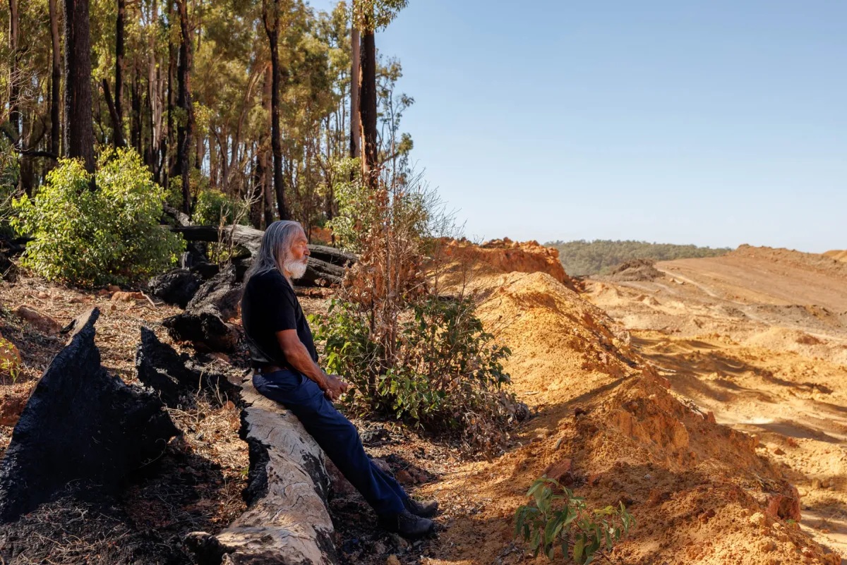 George Walley, a Noongar elder, sits at the edge of an Alcoa mine site near Jarrahdale, in Western Australia, on March 24, 2025. (Photo by Quinn Glabicki/PublicSource)