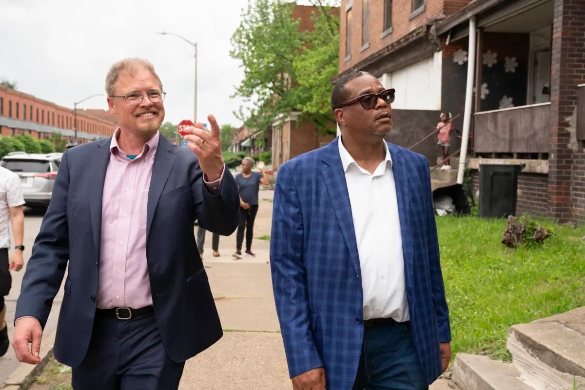 Kendall Pelling, executive director of Rising Tide Partners, leads Mayor Ed Gainey, reporters, and community members on a tour of properties that are to be renovated by his nonprofit on Friday, May 16, 2025, in Homewood. (Photo by Caleb Kaufman/PublicSource)