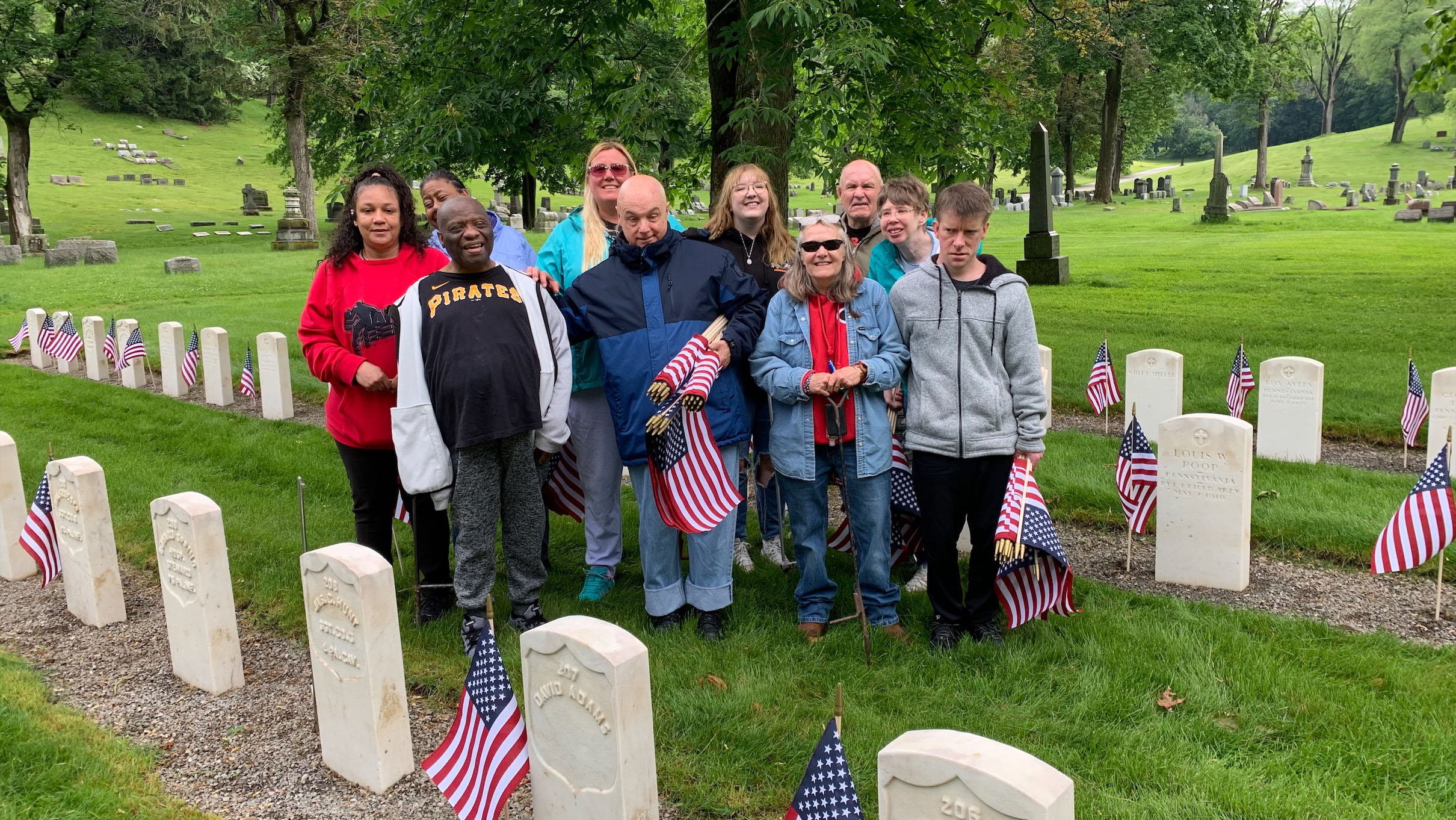 In preparation for Memorial Day, participants from Pittsburgh Mercy Intellectual & Developmental Disabilities Services’ day support and residential programs volunteered to decorate U.S. military veterans’ graves with flags to honor them for their service and sacrifice for our nation.