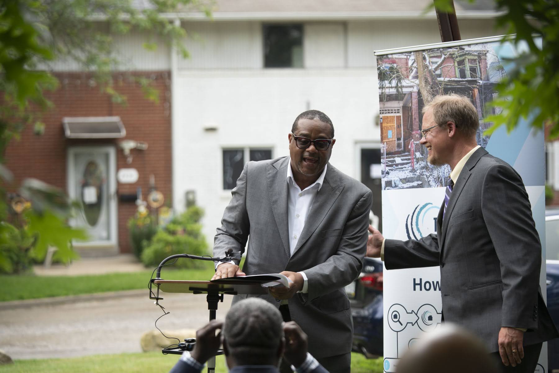 Mayor Ed Gainey speaks to Kendall Pelling, executive director of Rising Tide Partners, during an event showing the progress made in redeveloping homes in East Hills on June 13. (Photo by Caleb Kaufman/PublicSource)