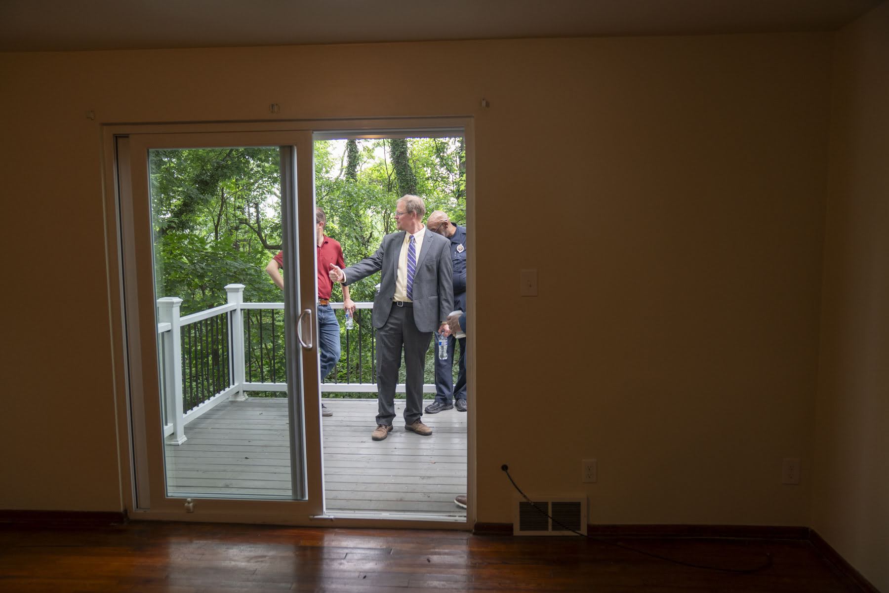Ross Kronenbitter, the construction manager for Rising Tide Partners, holds open the door for people to enter a recently rennovated home in East Hills on Friday, June 13, 2025. (Photo by Caleb Kaufman/PublicSource)