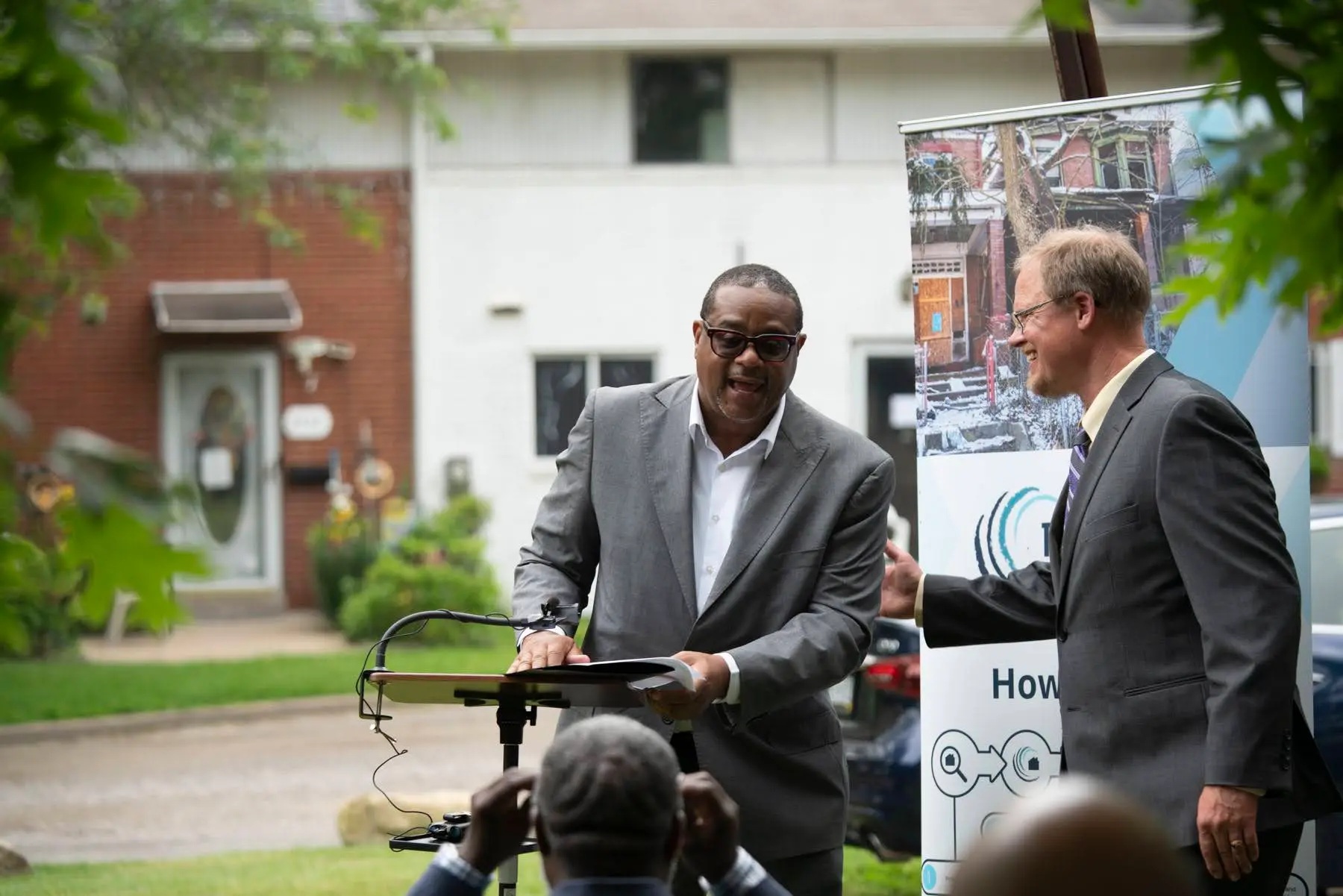Mayor Ed Gainey speaks to Kendall Pelling, executive director of Rising Tide Partners, during an event showing the progress made in redeveloping homes in East Hills on June 13. (Photo by Caleb Kaufman/PublicSource)