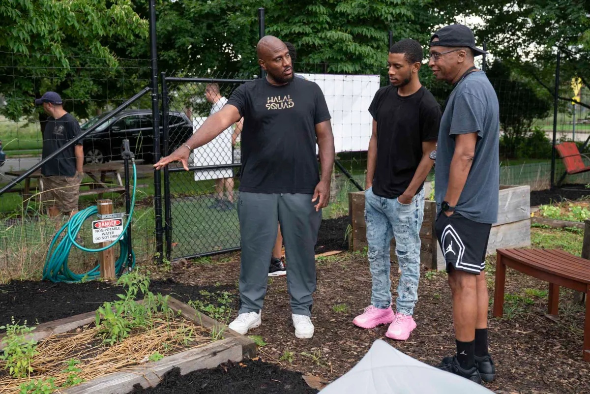 Bilal Cyrus, a community volunteer, talks with Lucas Moran and Charles Rowe in the Manchester Food for the Soul Community Farm on Thursday, June 19, 2025, in Manchester. (Photo by Caleb Kaufman/PublicSource)