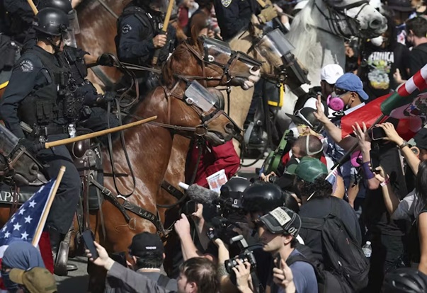 Here in Los Angeles where I teach journalism, for example, several images have seared themselves into public memory. One viral video shows a shackled father stepping into a white, unmarked van as his daughter sobs behind the camera, pleading with him not to sign any official documents. He turns, gestures for her to calm down, and blows her a kiss. In another video, filmed across town, Los Angeles Police Department officers on horseback charge into crowds of peaceful protesters, swinging wooden batons with chilling precision.