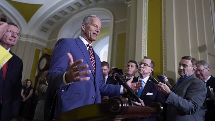Senate Majority Leader John Thune speaks with reporters about the reconciliation process to advance President Donald Trump’s spending and tax bill on June 3, 2025. AP Photo/J. Scott Applewhite