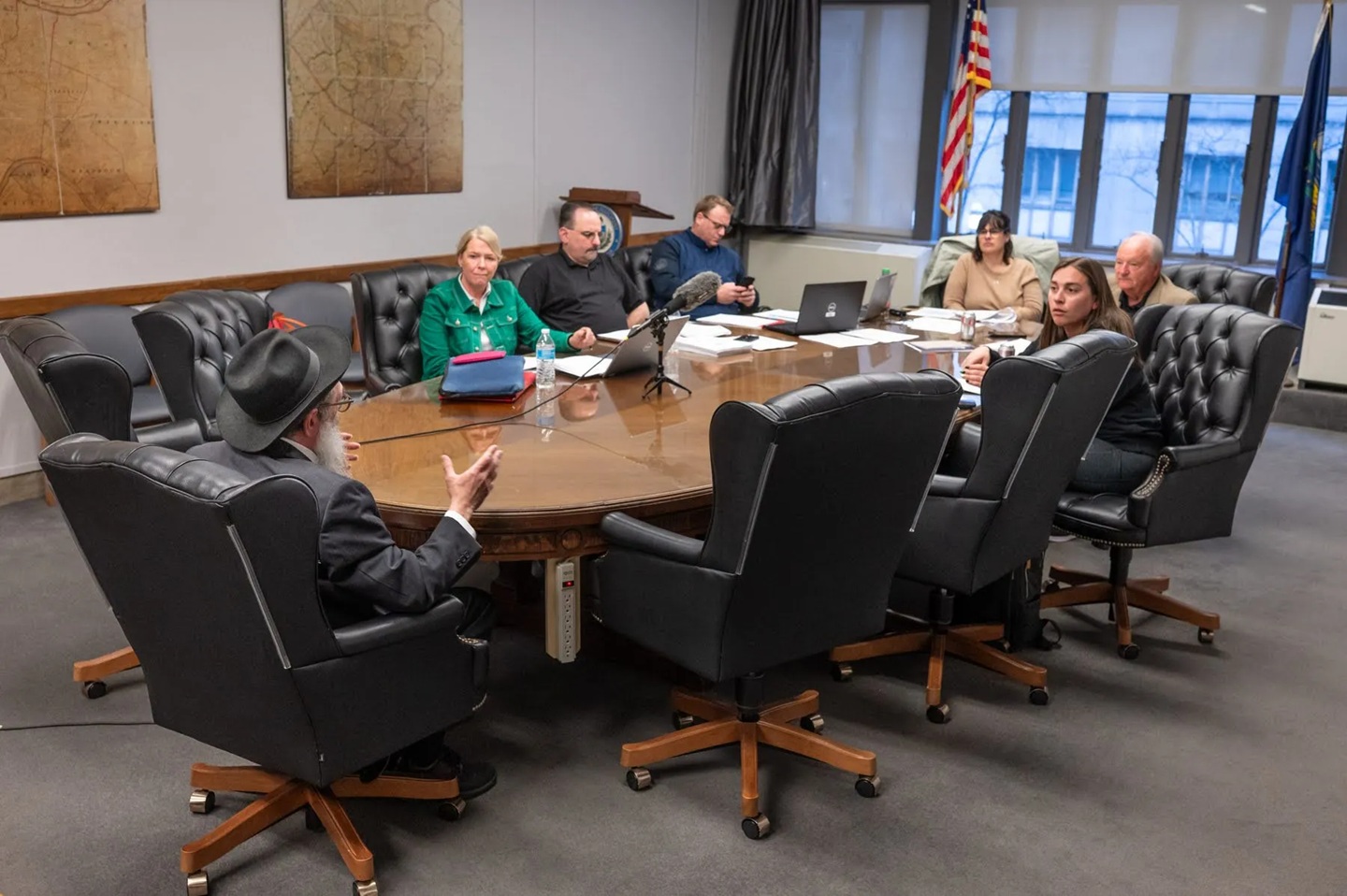 Rabbi Moishe Mayir Vogel, far left, responds to interview questions from a County Council committee before its vote to pick three finalists for a slot on the Juvenile Detention Board of Advisors, March 18, at the Allegheny County Courthouse in Downtown. (Photo by Stephanie Strasburg/PublicSource)