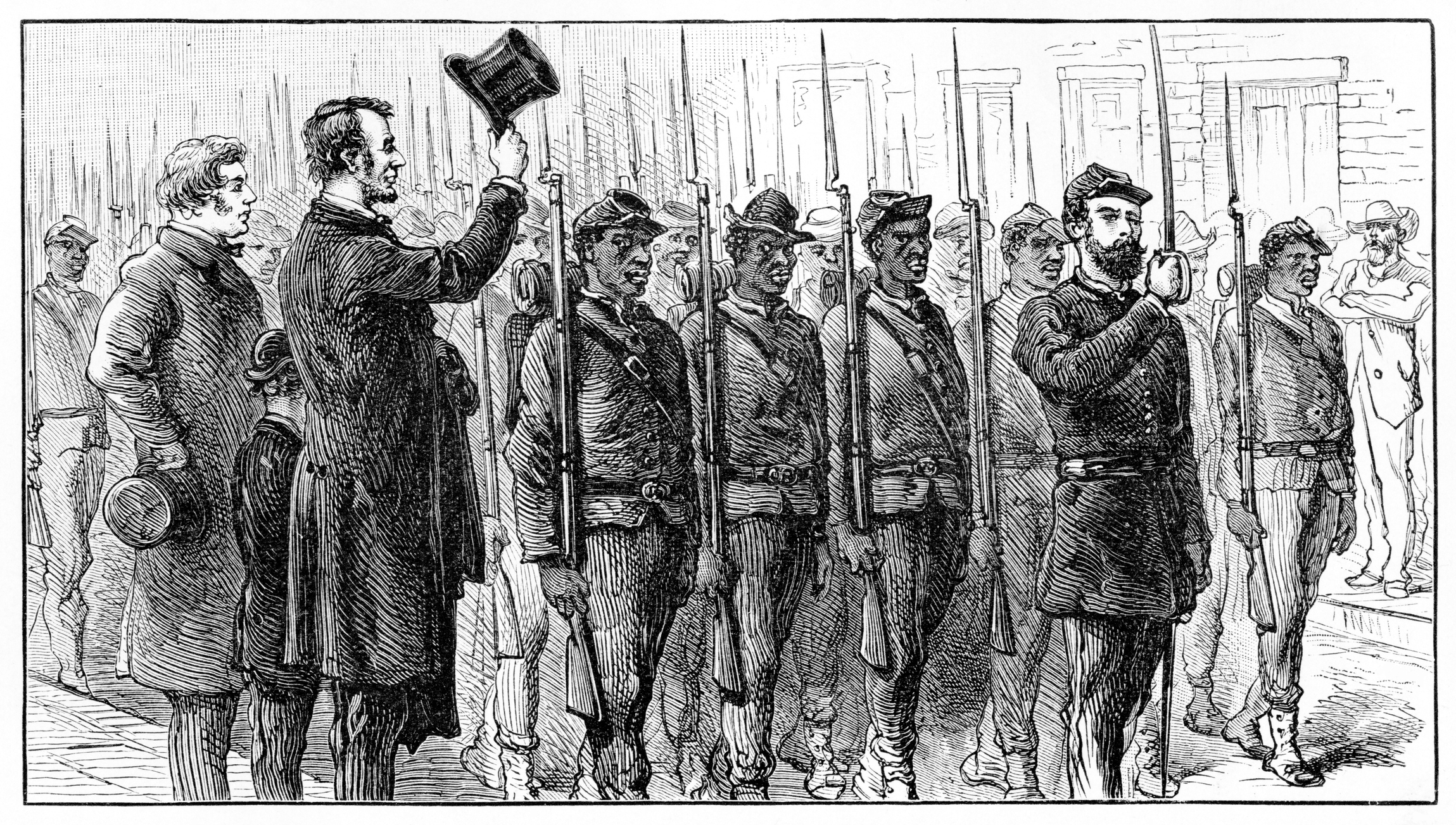 President Abraham Lincoln, with young son Tad and Senator Charles Sumner, salutes a detachment of African-American Union troops in Richmond, Virginia at the end of the American Civil War. Published in 1883, the illustration is now in the public domain. Digital restoration by Steven Wynn Photography. (Getty Images)