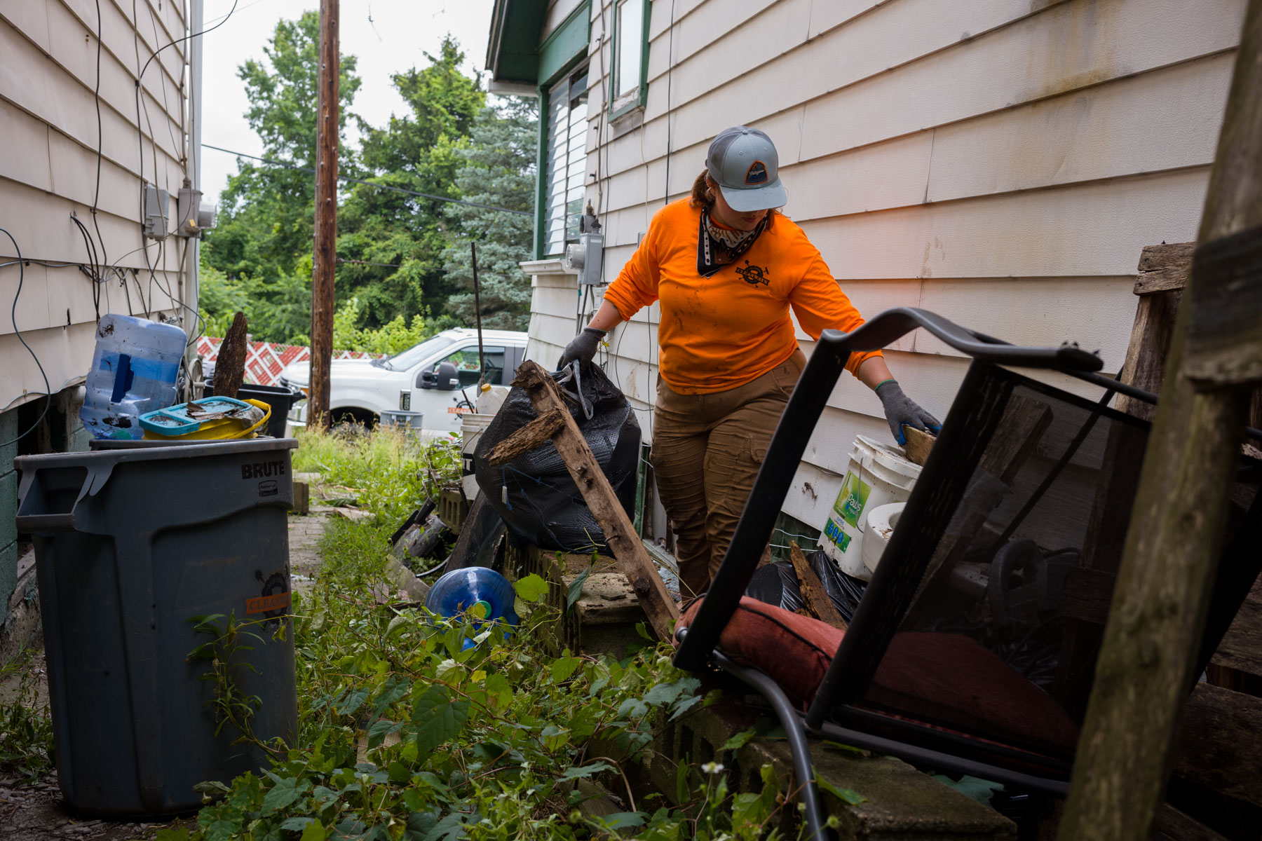 Lyssa Eberhardt and Asher Khersonsky, of Allegheny CleanWays, clear debris from condemned houses in McKeesport on June 27. The nonprofit organization, which cleans up illegal dumping across Allegheny County, recently lost funding as a result of cancelled federal grants. (Photo by Quinn Glabicki/PublicSource)