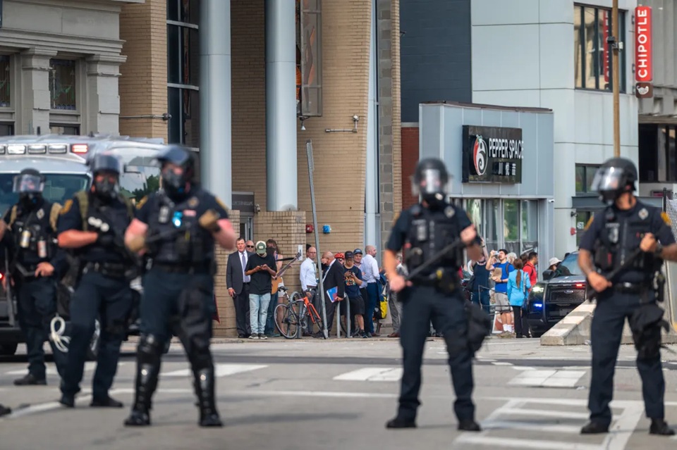 Pittsburgh police in Oakland during protests ahead of President Donald Trump’s visit July 15. (Photo by Stephanie Strasburg/Pittsburgh’s Public Source)