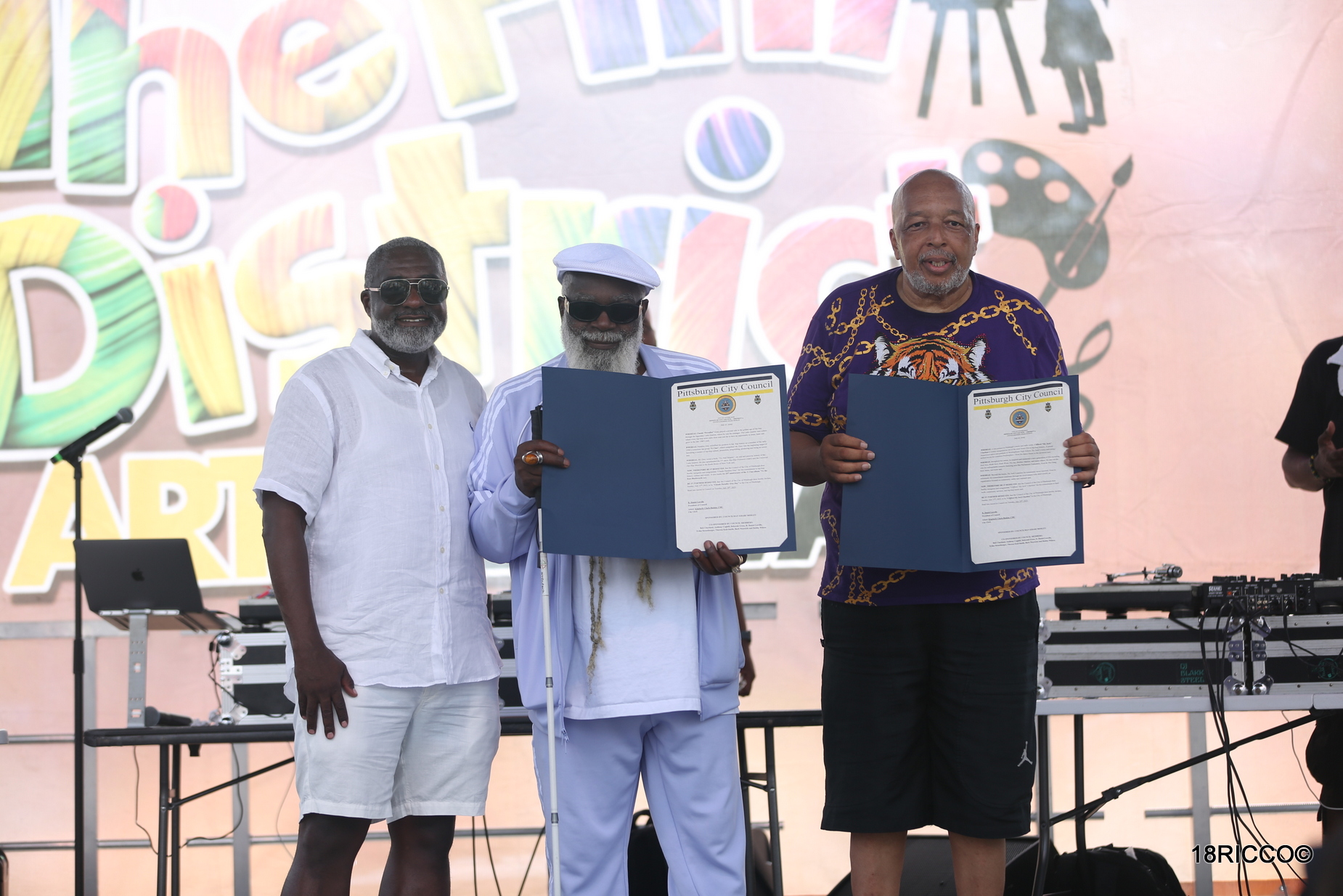 PROCLAMATIONS ARE IN ORDER FOR HIP-HOP LEGEND PARADISE GRAY AND WAMO RADIO LEGEND SLY JOCK. CITY COUNCILMAN KHARI MOSLEY, LEFT, PRESENTED THE PROCLAMATIONS AT THE HILL DISTRICT ARTS FESTIVAL, JULY 26. (PHOTOS BY J.L. MARTELLO)