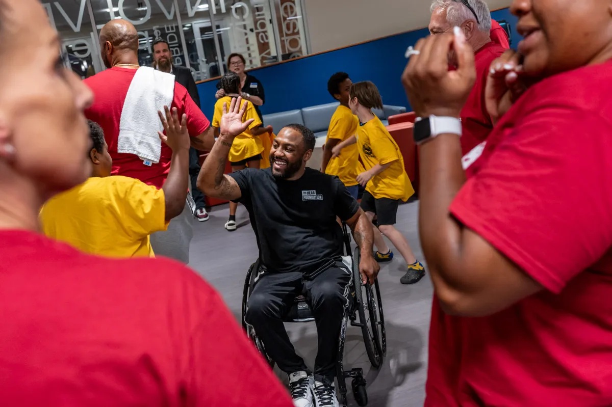 Leon Ford high fives youth at Cops and Kids Camp Thursday, July 31, 2025, at Duquesne University after talking to them about his relationship with the police years after being shot during a traffic stop. While the shooting left Ford paralyzed, he advocates for building trust and relationships between communities and police. (Photo by Stephanie Strasburg/Pittsburgh’s Public Source)