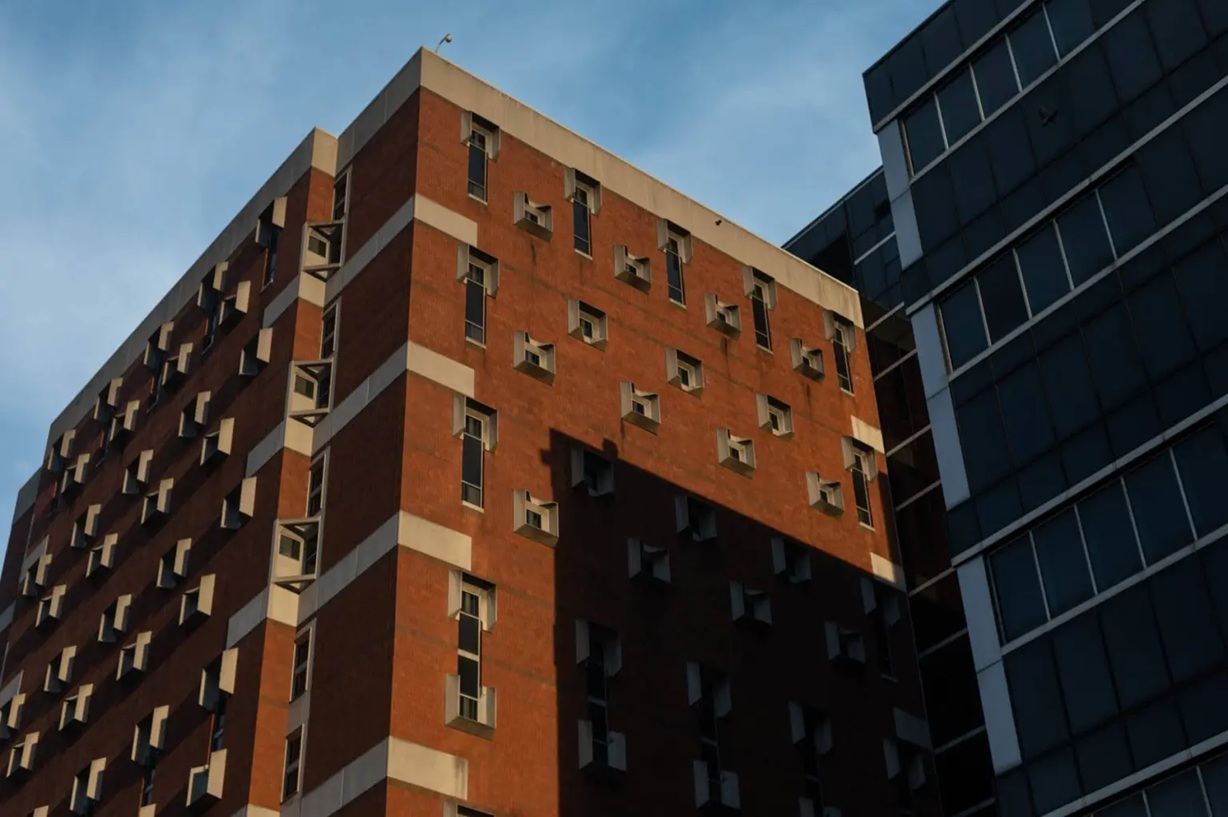 Cell windows along the side of the Allegheny County Jail, Friday, April 19, 2024, in Pittsburgh’s Uptown. (Photo by Stephanie Strasburg/Pittsburgh’s Public Source)