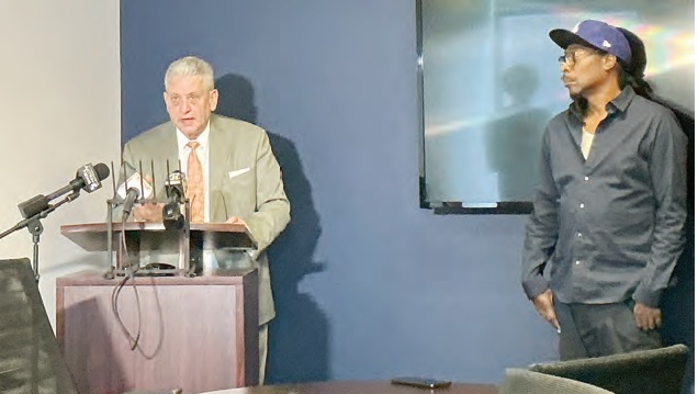 ATTORNEY JOEL SANSONE ANNOUNCES A CIVIL LAWSUIT AGAINST MAYOR ED GAINEY AND THE CITY OF PITTSBURGH ON BEHALF OF HIS CLIENT, B. MARSHALL, AUG. 27. (PHOTO BY CHIEF IKHANA-HAL-MAKINA)