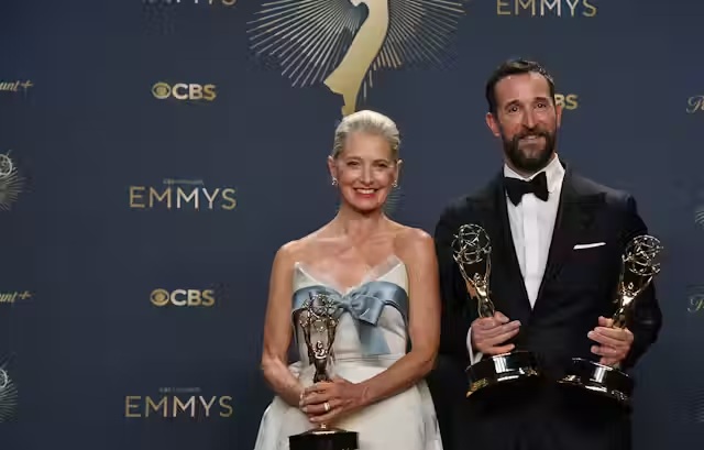 Katherine LaNasa and Noah Wyle, actors from ‘The Pitt,’ in the press room during the Emmy Awards on Sept. 14, 2025, with trophies for Outstanding Lead Actor and Supporting Actress, at the Peacock Theater in Los Angeles. (Richard Shotwell/Invision/AP)