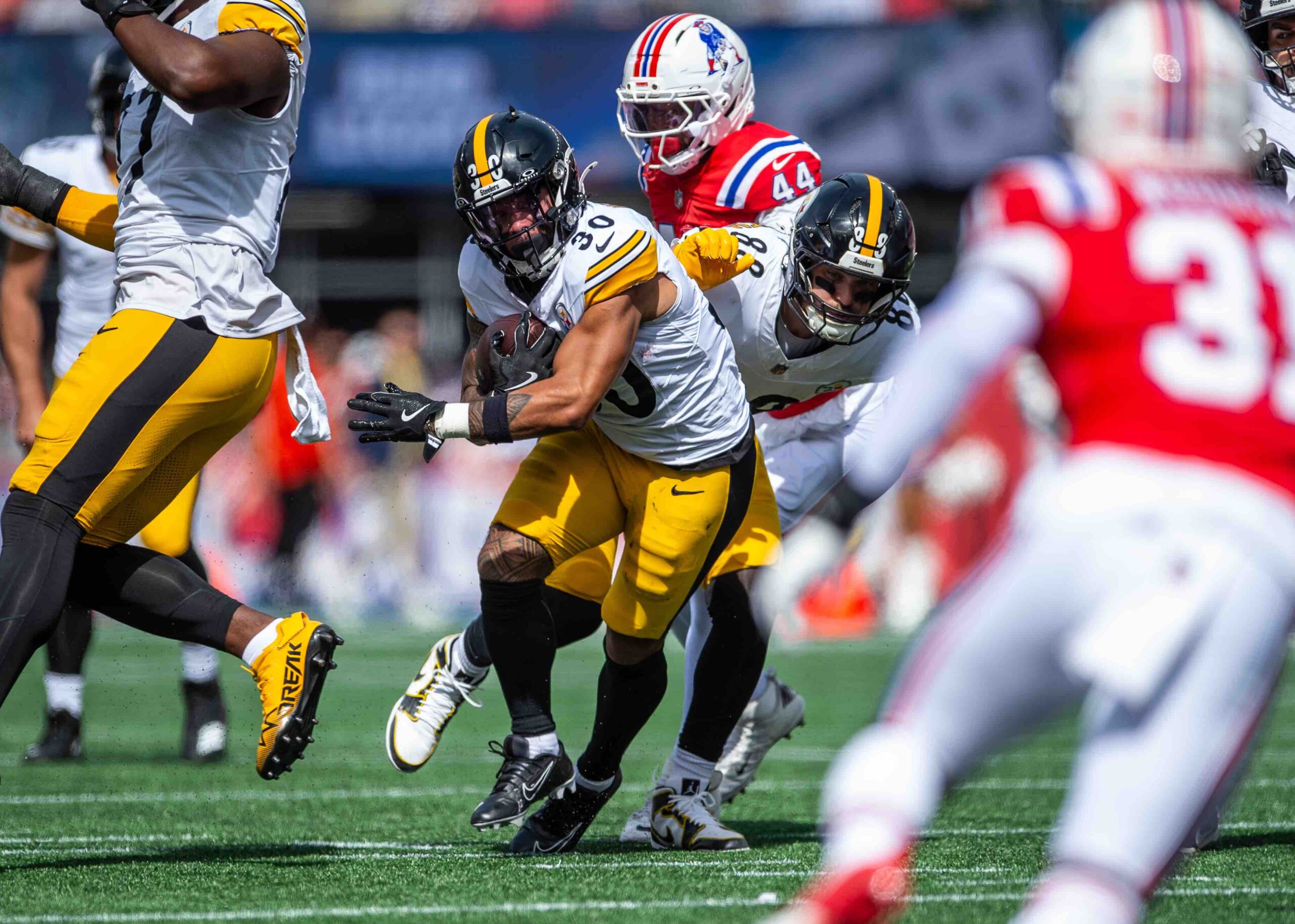 THE STEELERS’ JAYLEN WARREN HAD A BIG DAY AGAINST THE NEW ENGLAND PATRIOTS. THE STEELERS WON, 21-14, SEPT. 21. (PHOTO BY MARLON MARTIN)