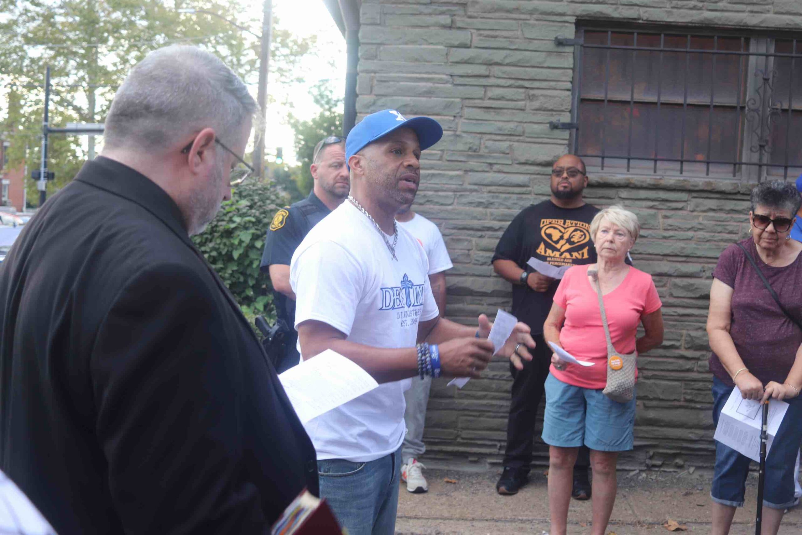 PASTOR MICHAEL SMITH OF DESTINY INTERNATIONAL MINISTRIES, PICTURED IN THE BLUE HAT LED A PRAYER VIGIL FOR PEACE FOR THE ENTIRE COMMUNITY, SEPT. 19. BUT MORE SPECIFICALLY, IT WAS A VIGIL FOR KEVIN VINCENT, WHO DIED IN A SHOOTING IN HOMEWOOD THE PREVIOUS WEEK. (PHOTOS BY ROB TAYLOR JR.)